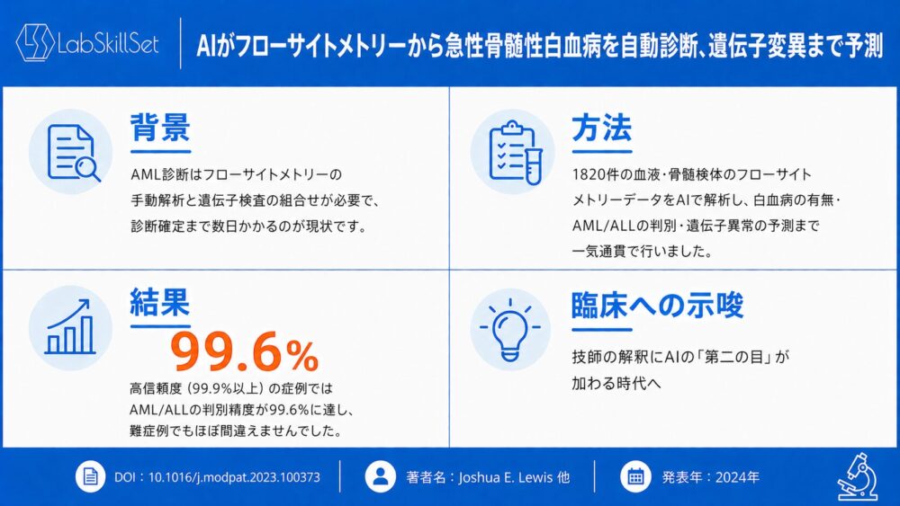 - フローサイトメトリーだけでAML診断と主要な分子異常を高精度に予測可能で、解釈可能性も確保された。